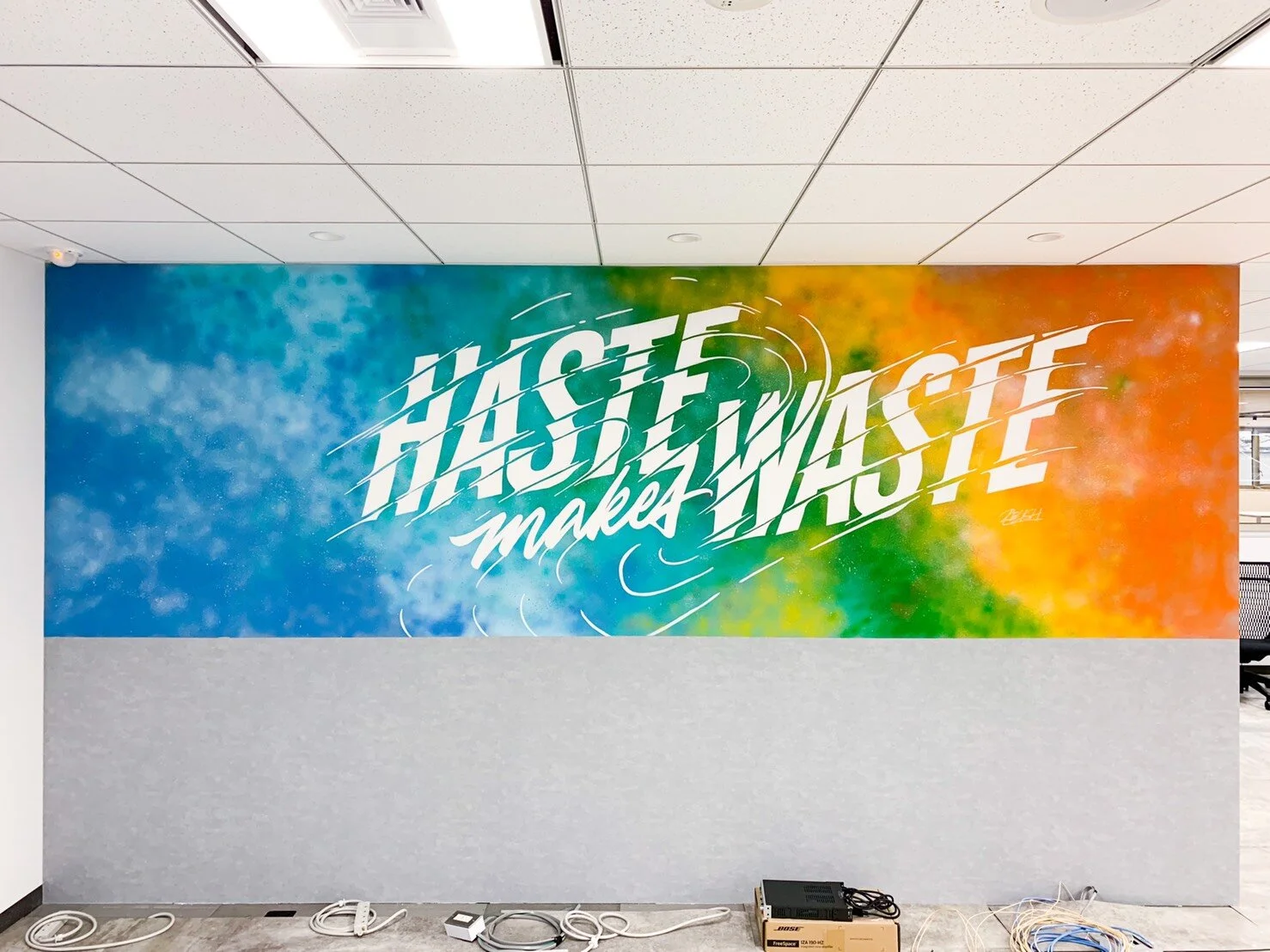 社員の憩いの場となるパントリーコーナーには、スプレーで制作した鮮やかなグラデーションの背景の上に「Haste makes waste.(急がば回れ)」のメッセージを。ポジティブな雰囲気とリフレッシュ感を醸成した。