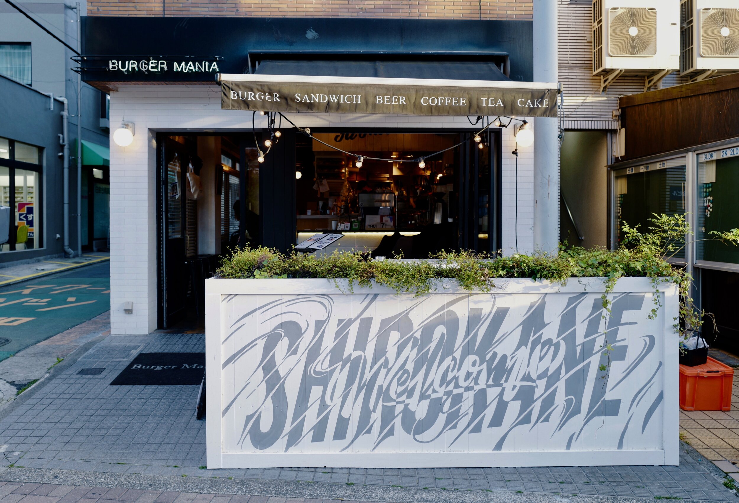 白金にあるハンバーガーの名店、BURGER MANIAのテラス壁面にペイント。