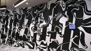 ITベンチャーの株式会社バズったー様のオフィスエントランスに壁画を制作。社名である「BUZZTTER」の文字を、大小多くの渦で取り囲み、バズが広がっていく様子とスタートアップさの疾走感を表現。モノトーンの色使いながら目を引く迫力のあるデザインに。
